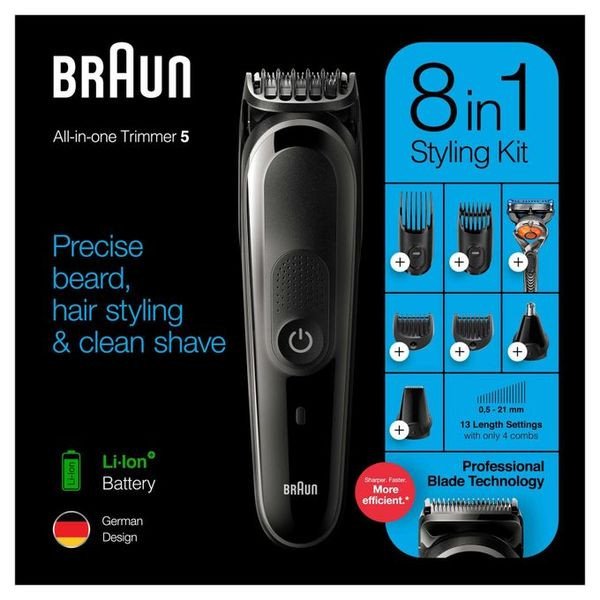 Tondeuse MGK5260 de BRAUN est une tondeuse 8 en 1 et offre une multitude de fonctions : entretenez votre barbe de 3 jours, les barbes courtes, moyennes ou longues, définissez les contours, obtenez un rasage de près, une tonte de précision, coupez vos cheveux, retirez les poils des oreilles et du nez.