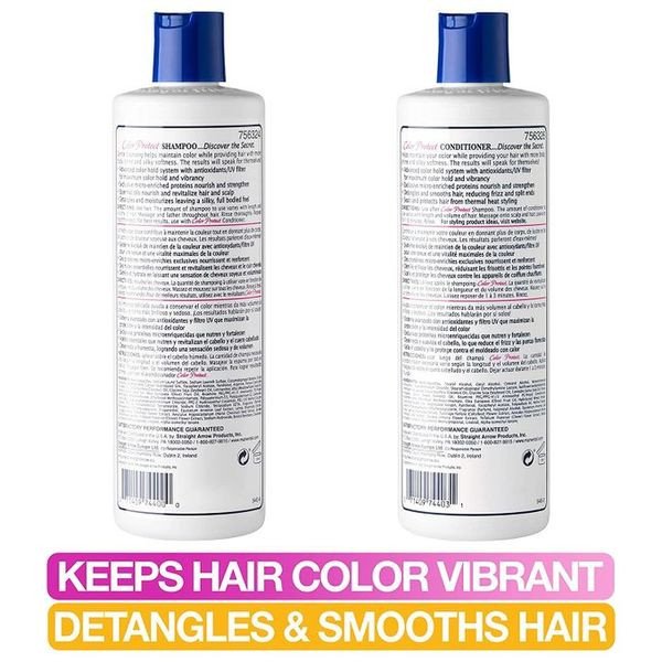 Beaucoup d'entre nous aiment colorer nos cheveux pour ajouter du style, mais ces teintures capillaires contribuent aux dommages capillaires. Ne vous inquiétez plus car Mane 'n Tail nous fournit un shampooing et un revitalisant Color Protect pour prendre soin de nos cheveux. Le shampooing Color Protect garde les cheveux plus sains, plus forts et plus éclatants! Ce shampooing aide à protéger les cheveux et le cuir chevelu contre d'autres dommages et garantit que les cheveux sont en bon état avant votre prochaine application de couleur. Ce shampooing nettoie soigneusement les cheveux, leur procurant brillance et volume durables, tout en conservant la couleur de vos cheveux. Ce shampooing donne de l'éclat à la couleur jusqu'au prochain traitement. Il conserve la force de vos cheveux et réduit la casse et aide à réduire les frisottis. Grâce à un mélange de ses principes actifs essentiels, votre cuir chevelu et vos cheveux de la racine aux pointes sont protégés. Le revitalisant Color Protect ajoute à votre système de soins capillaires complet. Ce revitalisant garde les cheveux plus sains, plus forts et plus dynamiques. Le conditionnement de vos cheveux les rendra plus beaux et hydratés! Faites ressortir vos cheveux grâce à leur couleur vibrante, et aussi parce qu'ils sont sains et loin des dommages! Pour une tenue maximale de la couleur, des cheveux plus vigoureux et une réduction des frisottis, et pour une protection thermique UV, laissez le shampooing et le revitalisant The Original Mane 'n Tail Color Protect faire le travail!
