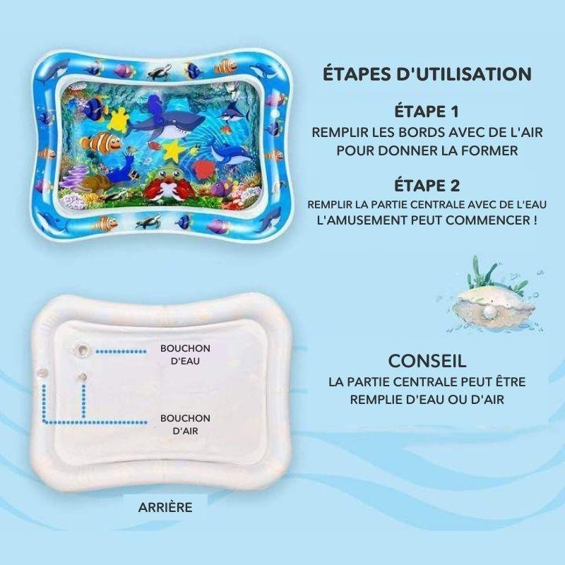 Laissez votre bébé nager dans un erveilleux monde marin coloré... dans le confort de votre salon ! Le Tapis d'éveil est un jeu fascinant, stimulant et amusant pour votre bout de chou. Il lui permet de passer un temps de jeu sur le ventre, ce qui essentiel à son développement (étude menée par plusieurs spécialistes de l'enfance). Il renforce ses bras et ses jambes tout en améliorant ses capacités motrices.