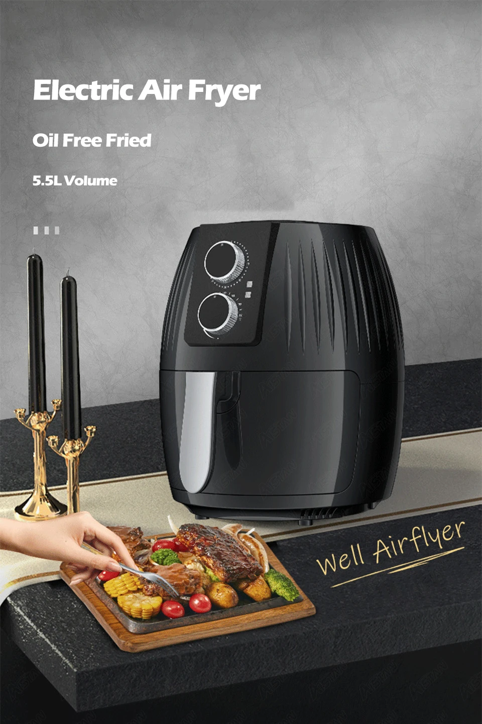 Notre friteuse utilise la technologie de recyclage d'air à grande vitesse, cette manière de frire se compare à la friteuse traditionnelle qui peut réduire efficacement la graisse de plus de 80%.