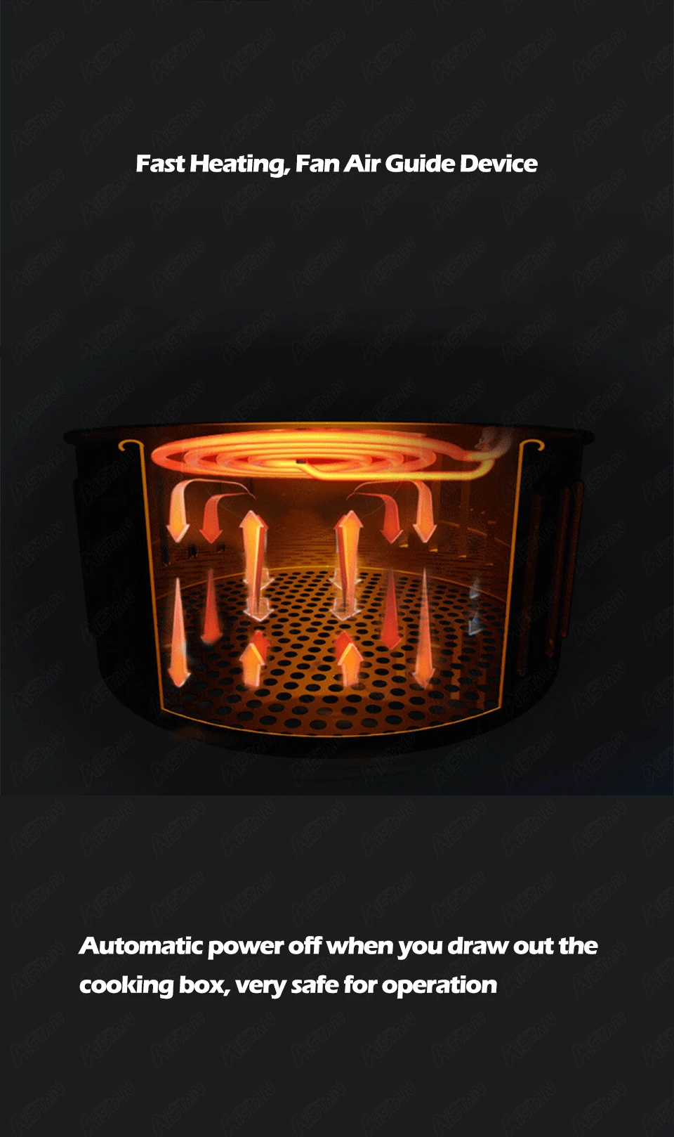 Notre friteuse à air a un protecteur de ventilateur, évite que le doigt de l'utilisateur touche le ventilateur du moteur, plus de sécurité, c'est également la séparation des aliments et de la plaque chauffante, évite le contact des ingrédients avec la plaque chauffante directement.