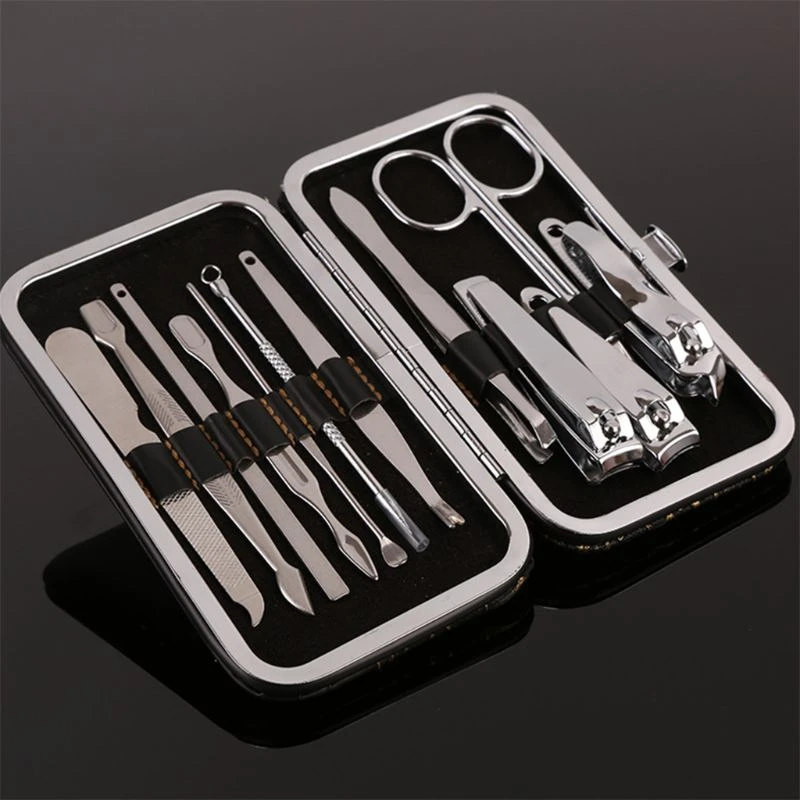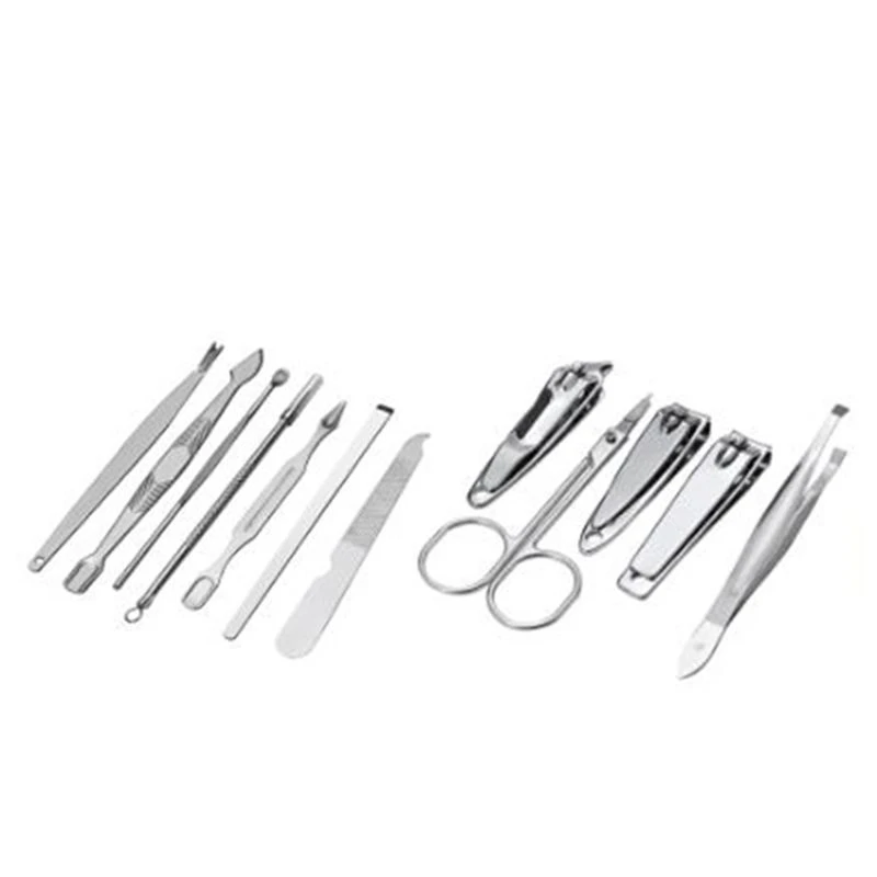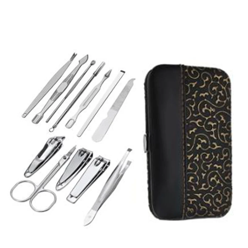 KIT de manucure 12 pièces: comprend un coupe-ongles, un coupe-ongles, un coupe-ongles en diagonale, des ciseaux multi-usages, un coupe-cuticules, un choix d'oreille, un poussoir double face à un tranchant, une pince à sourcils, couteau à éplucher, lime à ongles, aiguille à points noirs et dissolvant à boucles, poussoir en forme de V.
