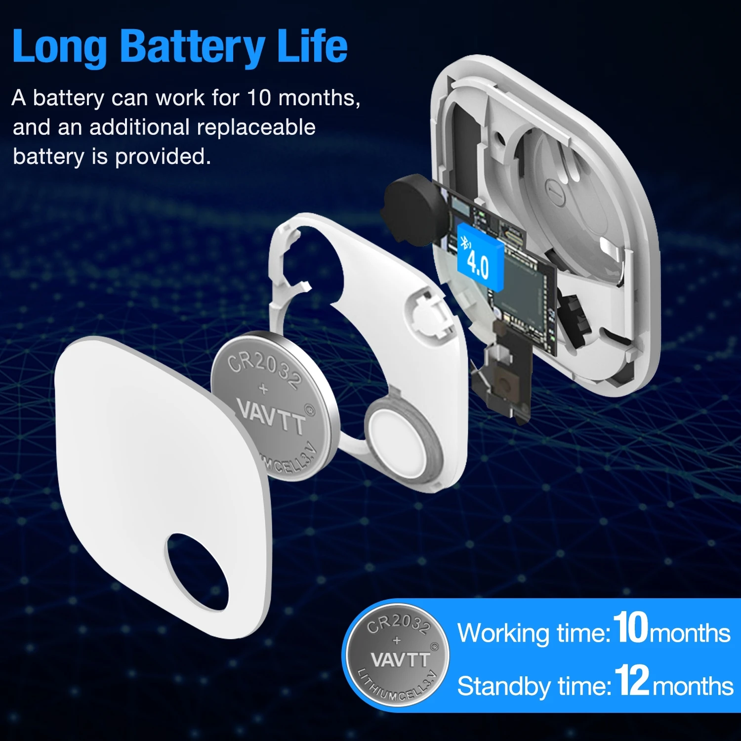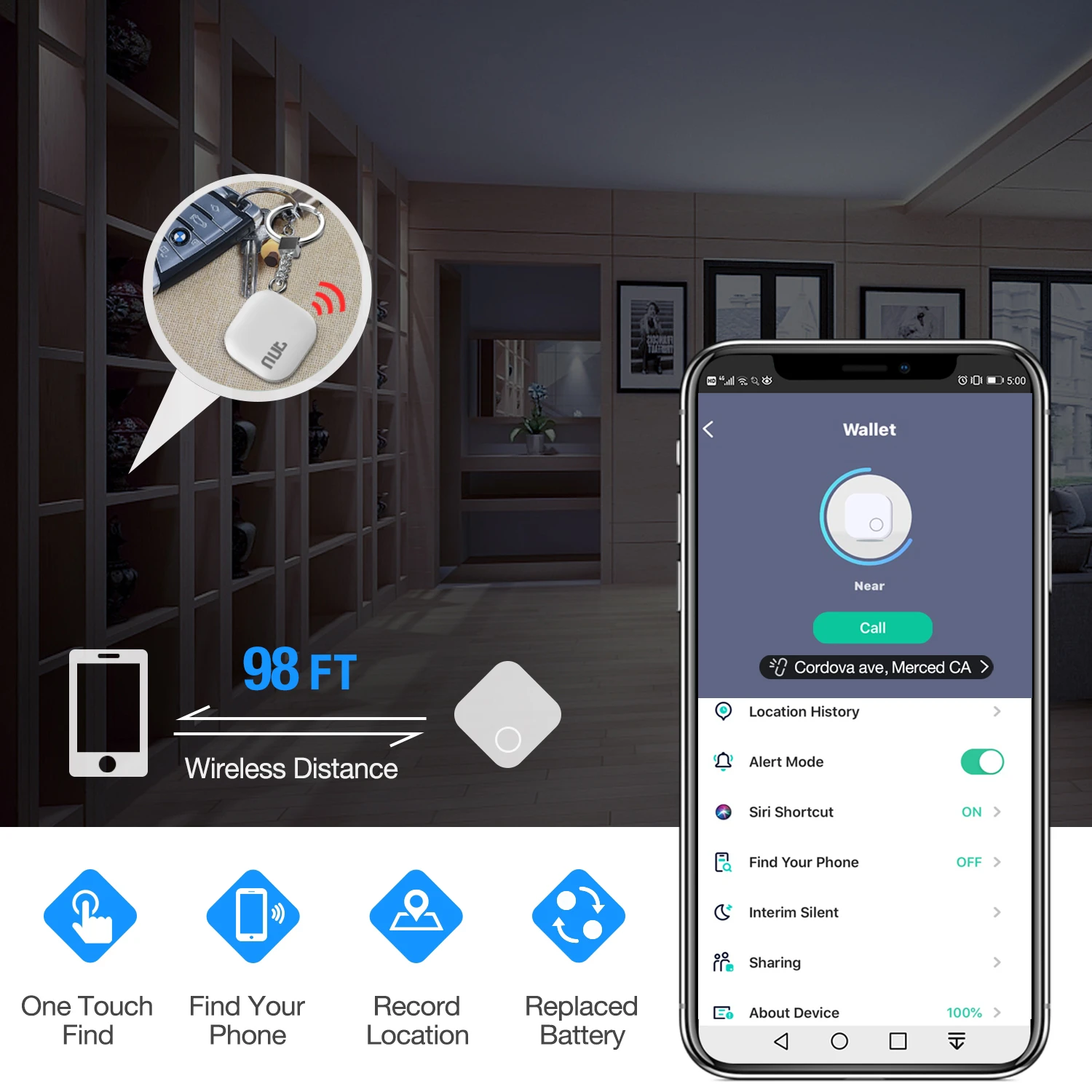 ► Fonction ANTI-perteLe détecteur de clé intelligente et le téléphone portable restent connectés via bluetooth. En mode alerte, une fois hors de portée de connexion bluetooth, le traqueur de touches et le téléphone portable feront du bruit qui vous rappelle vos articles.