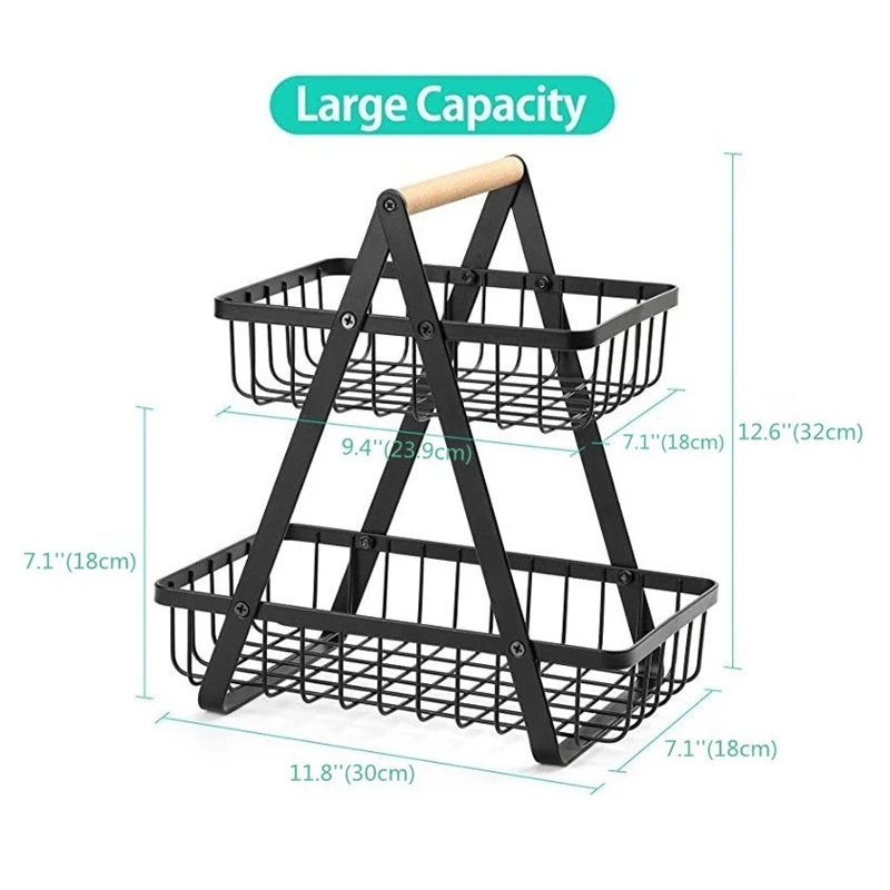 Porte-panier à Fruits amovible en métal, poignée en bois Portable, étagère à Double couches pour Fruits et légumes, grand accès
