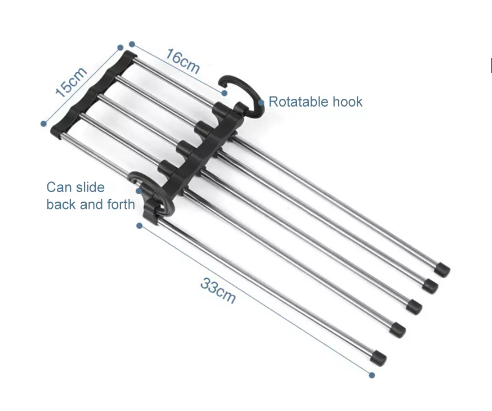 La conception 5-en-1 garde votre pantalon propre et bien rangé, économisant plus d'espace. Il y a deux crochets sur le dessus. Vous pouvez utiliser deux crochets pour la suspension horizontale ou simplement utiliser des crochets pour la suspension verticale. Cinq tubes en acier inoxydable sont utilisés, chacun pouvant être tiré vers l'extérieur pour une suspension et un recyclage faciles. Il peut également être utilisé comme étendoir. Fabriqué en acier inoxydable de haute qualité, il est résistant et facile à transporter. La conception 5-en-1 garde votre pantalon propre et bien rangé, économisant plus d'espace.